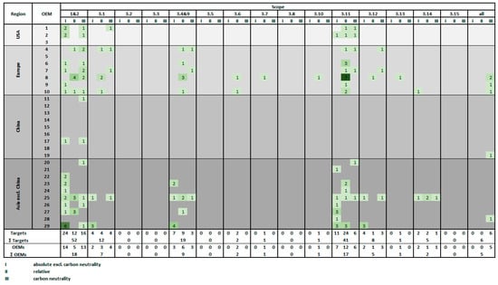 There are also regional differences in the choice of target years. In general, both European and Asian automakers are targeting carbon reductions in the short and long term. However, all European targets for 2050 are carbon neutrality targets, mostly covering several scopes/categories, which is in line with the European Green Deal aiming to make Europe climate neutral by 2050 [99]. Asian companies, however, set many targets covering individual categories, resulting in a higher number of targets in later years. Concerning public ambition communication, the analyzed data have revealed the aim of certain OEMs to act as front runners, and thus to be faster than the others. This can be interpreted as a sign of the importance of carbon reduction targets as communication instruments for stakeholders. Outpacing the competitors in terms of carbon reductions seems to be an incentive to aim to reach a certain emission level earlier. These differences in target ambitions and communication again make it difficult to compare targets.