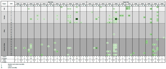 If an OEM develops a carbon reduction target, they do not only have to decide on the scope and characteristic (e.g., absolute or relative) of the target, but also have to decide which base year to take as a starting point and which target year to focus on for achieving the aspired reduction. The following figure, Figure 5, gives an overview of the chosen base years and target years for the identified carbon reduction targets. With regard to the chosen base years, a wide range can be seen. The OEM choices reach from 2000 to 2020, with three peaks in 2010 (16 targets by 8 OEMs), 2018 (14 targets by 7 OEMs) and 2019 (13 targets by 4 OEMs). Furthermore, regional differences can be identified. Whilst in Asia, excluding China, mostly earlier years have been chosen as a base year, European and US-based car manufacturers tend to use later base years.