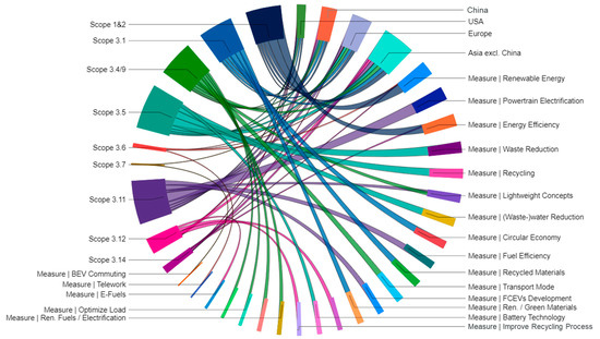 The evaluation considers regional differences and the emission category on which the measures have an effect. As in Section 3.1, it was possible to evaluate 26 of the 29 reports. Of those, all but one automotive manufacturer has planned measures for their direct scope 1 and 2 emissions. Here, the focus is on the use of renewable energies in the manufacturing stage (21 out of 26), as well as the reduction in the energy demand—for example, through efficiency measures (19).