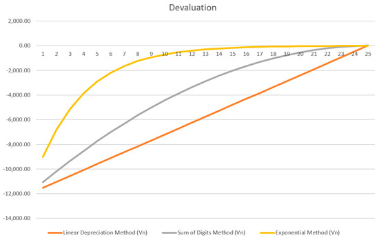 Figure 1 shows the results of the three devaluation methods without a reduction in Present Value. These results are relevant because of the next discussion of the Life Cycle models. A time interval of 25 years was considered. However, the real value of the market ought to be considered instead of using the Physical Asset Devaluation model.