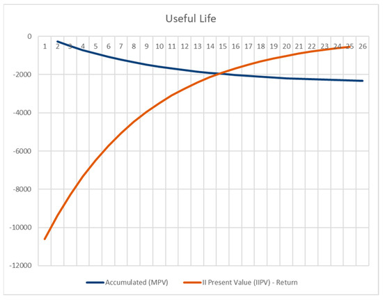 Figure 2 shows the Useful Life that results from the data above without a reduction in Present Value; the image shows that the useful life is 15 years, after which the equipment should be replaced or undergo renewal intervention.