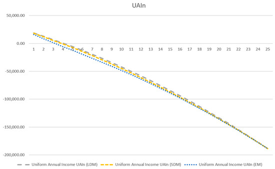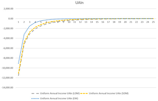 Figure 4 shows the Uniform Annual Income based on the three devaluation methods with a reduction in Present Value. As can be seen, Uniform Annual Income (UAI) is reached near the year 20. It is relevant to emphasise that this UAI approach only considers expenses.