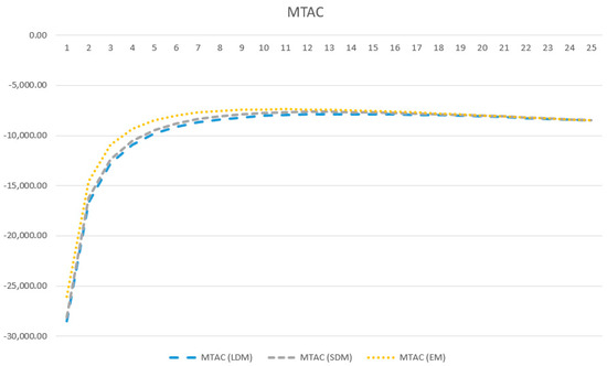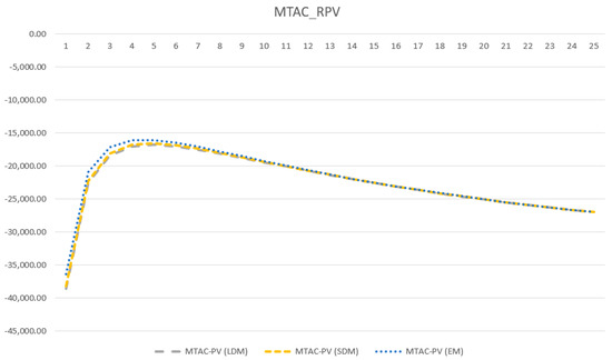 Figure 10 shows the Minimization of Total Average Cost Method (MTAC) based on the three devaluation methods with a reduction in Present Value. As can be seen, the minimum value is reached at year 5. It is relevant to emphasise that this MTAC approach only considers expenses.