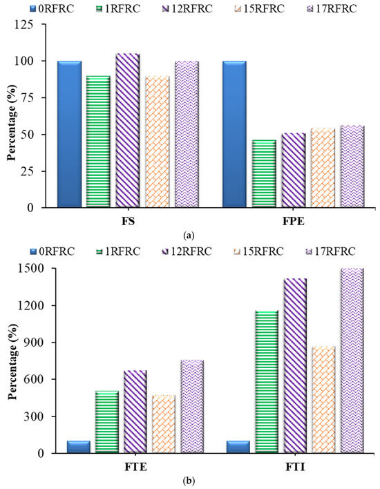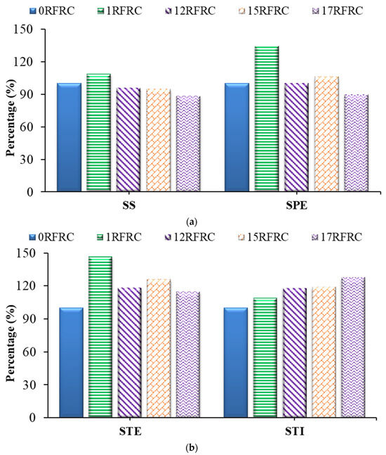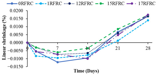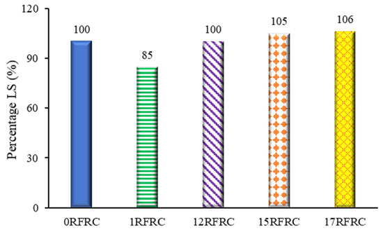 The linear shrinkage of specimens is represented as a percentage comparison in Figure 4. The LS of 15RFRC and 17RFRC increased by 5% and 6%, respectively, compared to 0RFRC. However, 1RFRC exhibited the best performance in limiting linear shrinkage, demonstrating 15% lower LS than 0RFRC. The LS for 12RFRC was the same as that of 0RFRC. The high dose of fibers (1%) effectively maintained the connectivity of RFRCs without compromising the uniformity of concrete and its ability to absorb tensile stresses. Previous studies have also reported a reduction in linear shrinkage with the incorporation of low dosages of industrial steel, polypropylene fibers, and recycled steel fibers [76,77]. The current research provides insights into the influence of high doses of RSFs on the linear shrinkage of concrete.