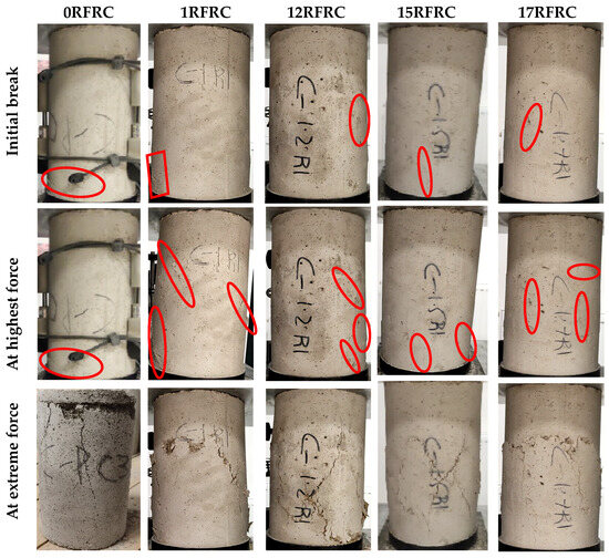 The stress–strain curves for compression loading are depicted in Figure 6, illustrating the response of the specimens to increasing compression loads. Notable differences in the stress–strain behavior are observed between RFRCs and 0RFRC. RFRCs exhibited ductile behavior with smooth stress–strain responses beyond the peak load, while 0RFRC failed abruptly with brittle behavior.