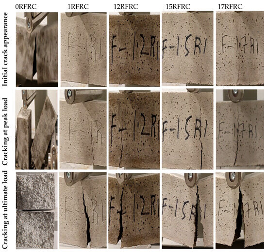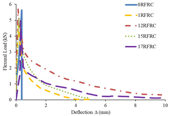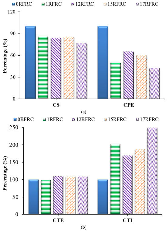 Table 3 presents the densities of the hardened specimens. A maximum density of 1971.1 kg/m3 was noted for 17RFRC. Compared to 0RFRC, the densities of 1RFRC, 12RFRC, and 17RFRC showed no significant change. However, a slight decrease of 2% was observed for 15RFRC. The presence of polyester and rubber in larger quantities, which have lower densities, could contribute to this slight decline. Previous studies have also reported that the density of RFRCs may exhibit slight variations [41].