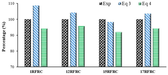 The European standard EN 12390-13 was used to determine the experimental value of the elastic modulus of specimens (EM). Table 5 presents the EM values for different RFRC samples, along with the corresponding coefficients of variation (CoV). The CoV values indicate the level of consistency among the three readings taken for each sample, with a maximum CoV of 7% observed, indicating good coherence among the measurements.