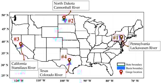 The proposed methodology was applied to predict MSA streamflow using two open datasets for selected case studies in various regions of the United States. The monthly historical streamflow data for the selected case studies were obtained from the United States Geological Survey (USGS) website, accessed on 1 August 2023 (https://waterdata.usgs.gov/nwis), as listed in Table 2. Mean, standard deviation (std), and maximum value of monthly streamflow for each caste study are given in Table 2. Other input variables, such as precipitation, solar index, humidity, and temperature, were obtained from the National Aeronautics and Space Administration (NASA) Langley Research Center (LaRC) Prediction of Worldwide Energy Resource (POWER) Project, funded by the NASA Earth Science/Applied Science Program (https://power.larc.nasa.gov, accessed on 12 September 2023), as shown in Table 3. The geographical distribution of the selected case studies in the United States is shown in Figure 1. These case studies represent distinct geographical areas with different annual precipitation levels. For instance, one of the case studies was situated in the northern part of North Dakota, while the other was located in the southern region of Texas. Additionally, there is a case study in the eastern region of California and western region of Pennsylvania. These diverse locations allow the examination of streamflow behavior across a range of hydrological conditions. Each case study encompasses unique catchment characteristics and annual precipitation levels, which contribute to varying average annual runoff volumes. These differences reflect the dynamic nature of streamflow across different climatic and geographical contexts.