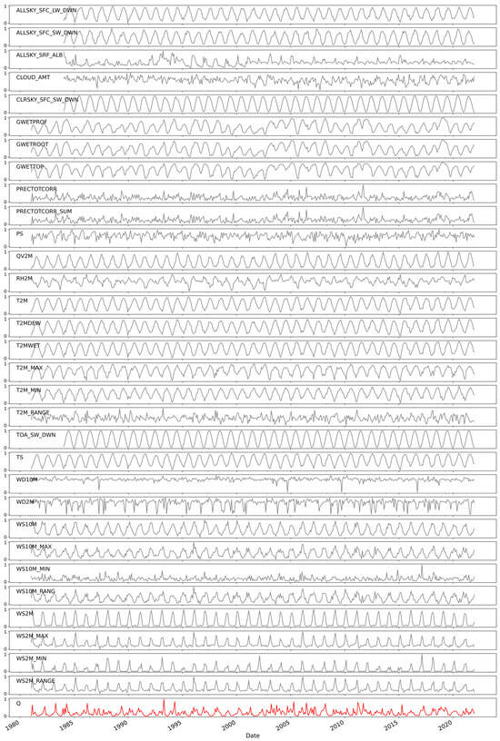 Input data preprocessing is initialized by first performing min–max normalization in the range of 0.001 to 1 to eliminate zero values and render the log transform feasible if required for specific data based on the Shapiro–Wilk test. The min–max normalized data for Case Study I are presented in Figure 3, and the same results for the other three case studies are presented in the Supplementary File.