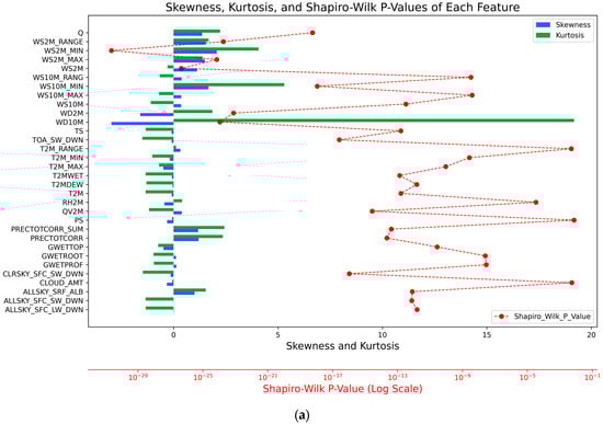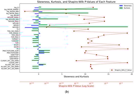 To validate the normality of the data, the skewness, kurtosis, Shapiro–Wilk p-value, Kolmogorov–Smirnov (KS) statistic, and Anderson-Darling (AD) statistics were investigated. Upon validating the log improvement of all 31 variables using a log transform, the improved data were replaced with their log-transformed counterparts. Consequently, the log-transformation reduced the skewness in the distribution of variables and rendered them more normal. Subsequently, all variables were standardized and prepared as input into the DR algorithms. The results of the Shapiro–Wilk p-Value to test the normality for case study I are presented in Figure 4a,b represents the selected variables that were replaced with their log-transformed counterparts. Same results for the other case studies are given in Supplementary File. Expanding further, ensuring the normality of the dataset was a paramount preprocessing step, considering its significance for various DR algorithms and ML prediction models. Figure 4 vividly demonstrates this procedure. The initial data assessment in Figure 4a highlighted pronounced skewness and kurtosis for several hydroclimate variables. After applying the log transformation, as depicted in Figure 4b, there is a noticeable improvement in the skewness and kurtosis for some variables, making them more symmetric. Although not all variables reached perfect symmetry, the effort to mitigate extreme skewness and kurtosis was evident. Thus, Figure 4 not only emphasizes the importance of data normalization but also highlights the benefits of our chosen method in moving towards this essential prerequisite for our subsequent analyses.