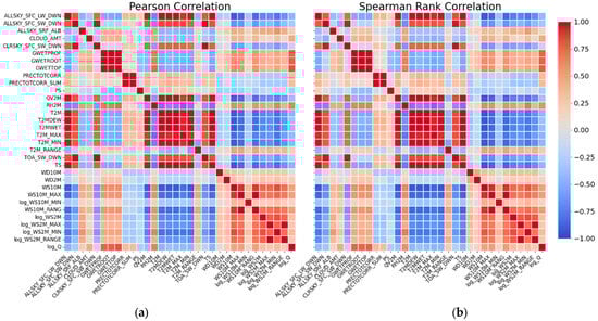 The heatmap of (a) Pearson correlation and (b) spearman rank correlation among all variables.