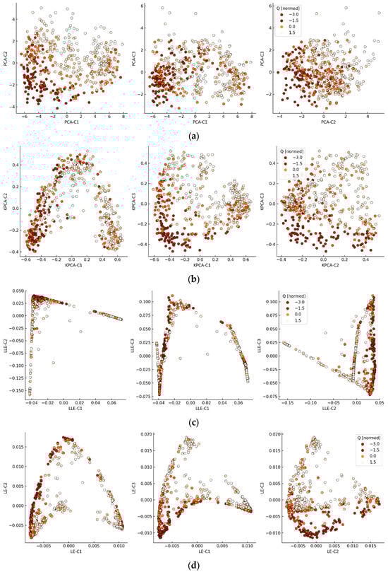 Another non-linear unsupervised DR technique employed in this study was t-distributed Stochastic Neighbor Embedding (t-SNE), which is a non-linear DR technique, as proposed by Van Der Maaten and Hinton in 2008. Rather than relying on a Gaussian distribution, this method evaluates the similarity between two points within a reduced-dimensional space using Student’s t-distribution. Given an input dataset, , with dimensions delineated as the t-SNE method derives an embedding in s-dimensions represented as . This method determines similarities in the original high-dimensional dataset using conditional probabilities based on a Gaussian distribution. Subsequently, in the reduced-dimensional space, the joint probabilities are computed using Student’s t-distribution, which is typified by a single degree of freedom, as follows: