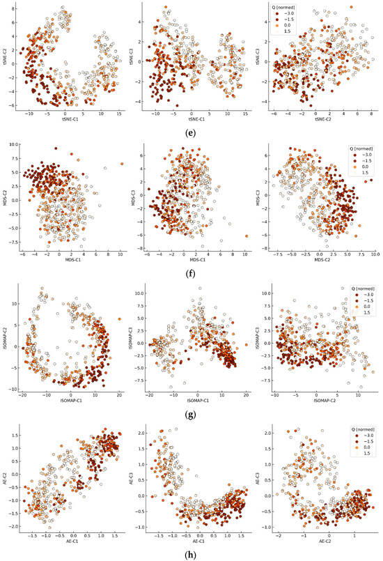 As illustrated in Figure 7, from a general point of view, AE, as a neural network-based method, has the ability to capture non-linear relationships. In most cases, the scatter plots exhibited complex structures, indicating that the AE components captured intricate patterns. The AE plots differed considerably across the case studies, with certain plots exhibiting tighter clusters, while other plots exhibit a more cloud-like distribution. This trend suggests that the ability of AE to capture non-linear patterns varies depending on the dataset used. t-SNE is designed to retain local structures and creates distinct clusters.
