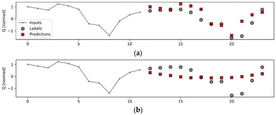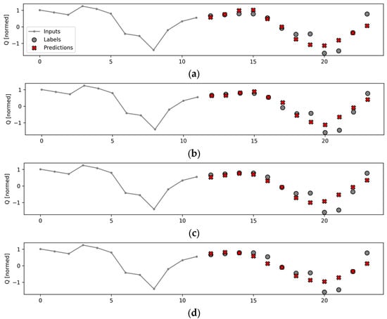 At this stage, endogenous features were utilized as inputs for the predictive models alongside historical streamflow records. A comprehensive hyperparameter-tuning process was performed using a grid search to ensure an equitable evaluation of the prediction models. This meticulous approach guaranteed fair assessments for all models. The Supplementary File lists the determined near-optimal values of the hyperparameter configurations for all the models. The cross-validation results for the two benchmarks are presented in Figure 9. This study employed a retrospective input sequence with a length of 12 and batch size of 16. This strategy effectively replicated prevailing annual conditions, enabling the generation of MSA streamflow predictions for the subsequent 12 months. The MSA prediction results (12 steps input and 12 steps output) for the two benchmarks for 1 year for the test sets are shown in Figure 10 and Figure 11. The same results for all models over the four years of test sets for Case study I are provided in the Supplementary File. As shown in Figure 10, using the baseline as the repeat of the previous year yielded better results than using the univariate linear and dense models, indicating the poor univariate performance of these two models, particularly for MSA streamflow prediction. As illustrated in Figure 9, simpler models such as linear and dense models exhibited considerable improvement when PCA was used as the DR technique.