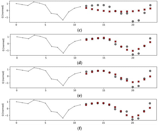 12-steps ahead prediction results of (a) baseline, (b) univariate-linear, (c) univariate-dense, (d) univariate-CNN, (e) univariate-LSTM, and (f) univariate-AR-LSTM for case study I.