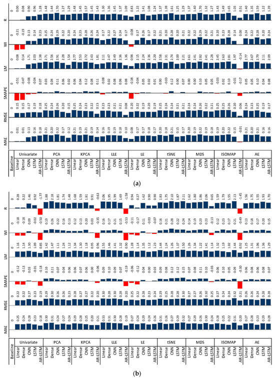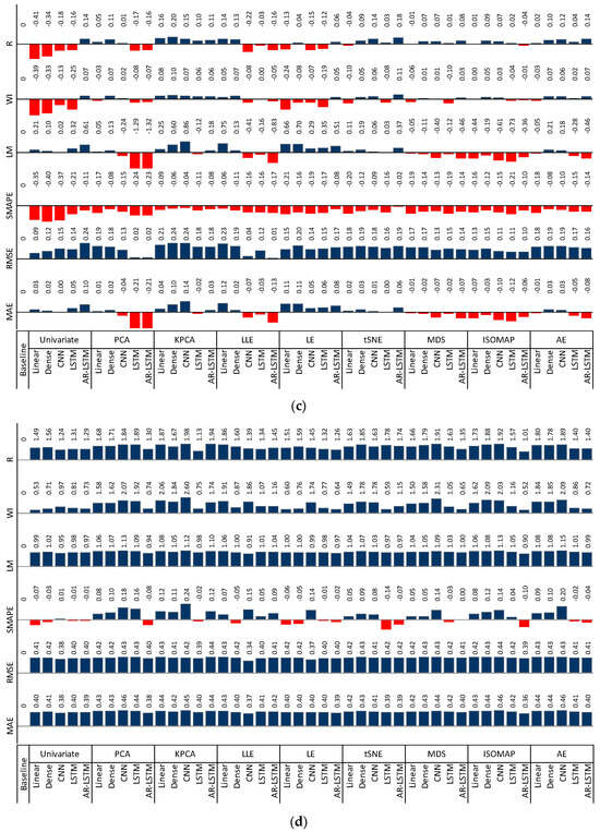The comparison results of the various ML models with different DR techniques for Case Study I are listed in Table 4. For the other case studies, the results are provided in the Supplementary File. The top 10% values for all performance indices are highlighted in bold compared to the baseline values. As shown in Table 4, the consistent improvement across all case studies indicates the general superiority of DR techniques in enhancing the prediction capability of all types of neural network layers in comparison with the baseline and univariate models. As shown in Table 4, the application of PCA with CNN led to a 22% improvement in terms of MAE. In terms of the RMSE, the MDS-CNN improved the prediction performance by 26%. The KPCA-CNN improved the prediction performance by 12% in terms of SMAPE. Moreover, the PCA-CNN enhanced the prediction performance by approximately three times compared to the baseline. In terms of WI, for both CNN-PCA and CNN-MDS, we observed a 29% improvement in the prediction result and an improvement of more than 1.5 times in terms of R. In Case Study IV, Fitting CNN with components extracted from AE, ISOMAP, KPCA, and PCA was ranked among the top 10% performance improvements. In Case Studies I and II, CNN with KPCA and t-SNE were among the top 10% performance improvements. In Case Study II, PCA and t-SNE improved the performance of dense LSTM and AR-LSTM, respectively. Because the results are similar, the one-size-fits-all approach may overlook the potential benefits of tailored DR with prediction layers. Therefore, we prefer to prioritize the generalization of methods over selecting and reporting the best DR techniques.