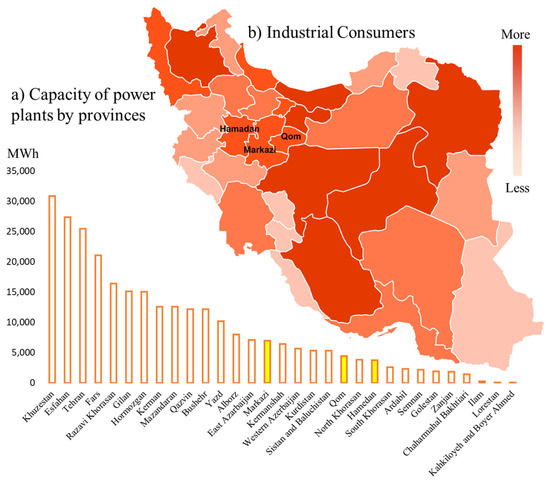 (a) Capacity of electricity power plants in Iran; (b) heat map of industrial consumers by province (source: Iran Small Industries and Industrial Parks Organization).