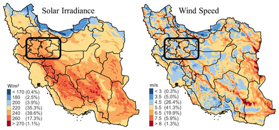 Solar irradiance and wind speeds in Iran (source: [17]).