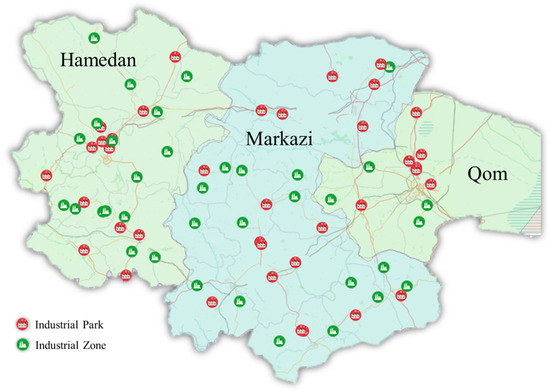 Since waste management centers provide one of the most essential urban infrastructures, the proposed waste management center location model’s performance was evaluated in three Iranian provinces: Hamadan, Markazi, and Qom. As mentioned in the introduction section, these three provinces, particularly Markazi at the area’s center, contribute significantly to the country’s production levels. Below (Figure 3) is a map illustrating the industrial zones and parks found in these three provinces.