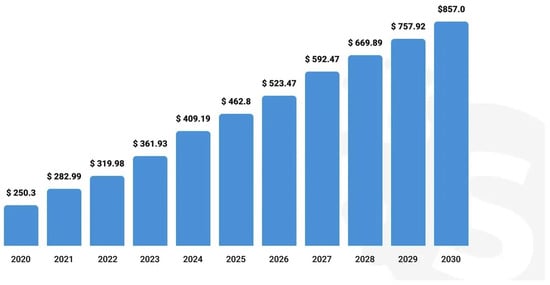 The market for healthcare services worldwide nearly reached USD 7.5 trillion in 2022 and is expected to keep expanding, topping USD 9 trillion in 2026. In addition, the healthcare IT market is expanding significantly. It reached USD 320 billion in 2022, surpassing Precedence Research, and is anticipated to reach USD 857.6 billion by 2030. The need for remote monitoring, cooperation among healthcare facilities, and readily available and safe care is expanding, according to a new Deloitte analysis. Thus, in order to meet this need and have the intended influence on patient care, healthcare experts look for new medical technology []. Figure 1 shows the healthcare IT market size from 2020 to 2030 in USD Billion.