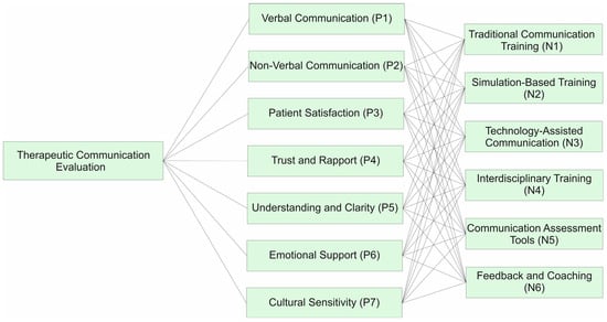 The nurse must be able to remain calm and focused while trying to aid the elderly patient in becoming a member of the therapeutic process. If the expertise is documented, an analyst can evaluate it. The assessment’s structural representation is composed of seven criterion categories []: Verbal Communication, Nonverbal Communication, Patient Satisfaction, Trust and Rapport, Understanding and Clarity, Emotional Support, and Cultural Sensitivity, designated by P1, P2, P3, P4, P5, P6, and P7; these allow one to choose the most effective method of therapeutic communication among different alternatives. The six methods of therapeutic communication for mental health nurses as alternatives evaluated are Traditional Communication Training, Simulation-Based Training, Technology-Assisted Communication, Interdisciplinary Training, Communication Assessment Tools, and Feedback and Coaching, indicated by N1, N2, N3, N4, N5, and N6, respectively. Table 1 lists the several criteria utilized for measuring the therapeutic communication of mental health nurses. Further, Table 2 shows different methods of therapeutic communication for mental health nurses.