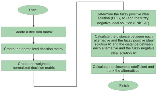 TOPSIS is a widely recognized approach within the field of MCDM. It serves as a valuable and practical tool for assessing and choosing the most suitable options by considering calculated coefficients. In essence, TOPSIS provides a structured way to evaluate and rank alternatives based on multiple criteria, enabling a more informed decision-making process. Hwang and Yoon [] devised the TOPSIS technique, which is based on the premise that the preferable course of action should closely approximate the positive ideal solution (PIS). The PIS approach provides the highest competitive advantage across multiple criteria while minimizing cost issues. At the same time, it aims to maximize benefit criteria while significantly lowering profit-related concerns.