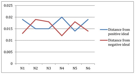The researchers collected the dataset for this study using a conventional fuzzy scale, as outlined in Table 4, along with mathematical Equations (1)–(9). This dataset was structured to assess various options based on specific criteria. The outcomes of this assessment are detailed below. Table 5 presents the selection matrix, which provides the average values across all 95 evaluation procedures. Additionally, Table 6 introduces a normalized decision model, while Table 7 displays the weighted normalized decision matrix. Further insights into the evaluation process are provided in Table 8 and Table 9, which present the positive and negative ideal alternatives and their respective distances from these ideal benchmarks. Figure 4 shows the graphical representation of distance from positive and negative ideal solutions. Finally, the study’s closeness coefficients are presented in Table 10 and Figure 5. These datasets and the associated computations serve as a comprehensive foundation for the assessment and ranking of the alternatives within the scope of this research.
