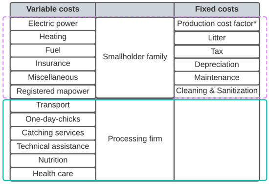 Scheme representing the division of inputs for cost assessment in a conventional broiler production system. The inputs are divided according to their respective partners in variable and fixed costs. Note: the dashed line square shows the inputs under smallholder responsibility, and the continuous line square shows the inputs under processing firm responsibility. Despite some particularities among broiler processing firms, this is the most common division of responsibilities. * Production cost factor = opportunity cost of working capital, land, facilities and equipment use.