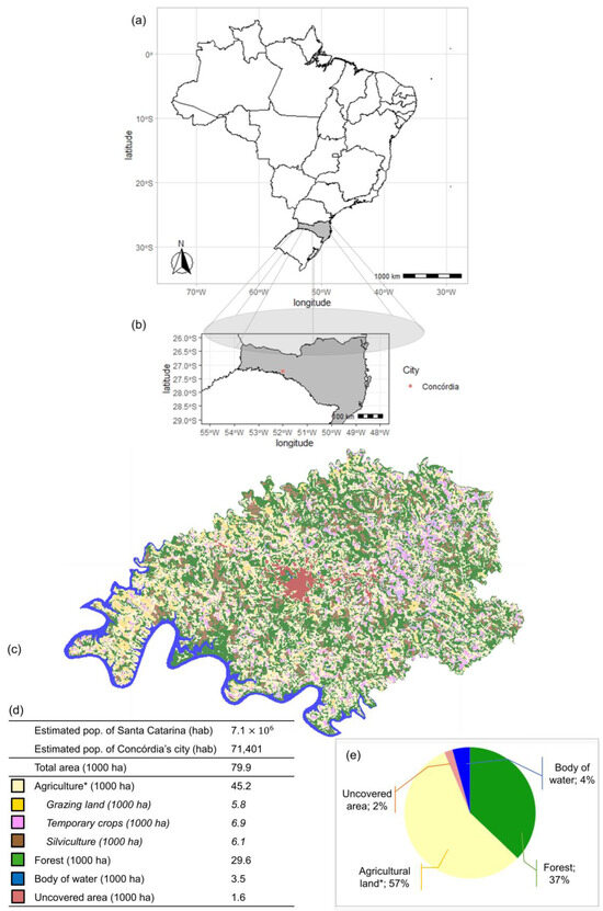 Location of Concórdia (Santa Catarina, Brazil), with area and population information for 2018. (a) Brazilian map and location of Santa Catarina. (b) Location of Concórdia (pink point). (c) Land cover and landscape distribution of Concórdia. (d) Numerical information regarding land cover and landscape distribution of Concórdia; (e) Percentage of the Concórdia landscape distribution. Source: (a,b) available at https://www.gps-coordinates.net/, accessed on 18 July 2023 (for latitude and longitude data); (c–e) available at https://mapbiomas.org/, accessed on 18 July 2023. * Considering agricultural land as the sum of grazing land, temporary crops and silviculture.