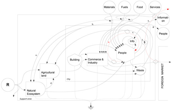 Emergy diagram of an urban ecosystem for Concórdia (Santa Catarina, Brazil). Source: adapted from Su et al. [37]. Note: R represents the local renewable resources. a Vegetable biomass providing ecosystem services for dissolution of negative externalities. b Landscape aesthetic contemplation. c Agricultural workforce. d Ecosystem services supporting agricultural production. e Monetary flow used to pay for goods and services in the support area. f Economic assets used to pay for services from outside of the support area. g People exchange. h Information exchange (i.e., social media, the specialized literature, social interaction, etc.).