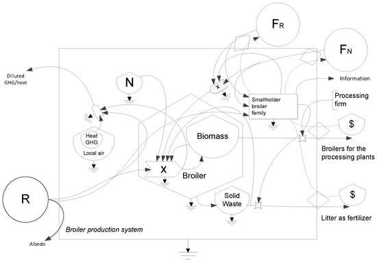 Emergy is a theory and method that quantifies all energy inputs (embodied energy) needed to generate some product or service [24,25,26]. Emergy synthesis can put together all environmental, economic, and sociocultural efforts provided by the smallholder families to the broiler production chain in a unique common base (solar-equivalent energy). Converting this total flow into a monetary-equivalent payment is a way to quantitatively bring the intangibles (cultural information and other hidden costs) into economic indicators. According to Abel [18], emergy synthesis is a tool for characterizing the system structure, namely whether or not it is self-organized with information control. Where information does exist, emergy is a method for judging the relative impact of its control. It is a means to “locate” its production within the hierarchy of energy transformation processes [18]. Thus, measuring all energy-matter inputs used in broiler production in a common base (solar-equivalent energy) and then converting the flow to a monetary-equivalent payment could be a way to quantitatively bring the intangibles into economic indicators and search for a holistic view-based payment for the smallholder broiler family through their services.