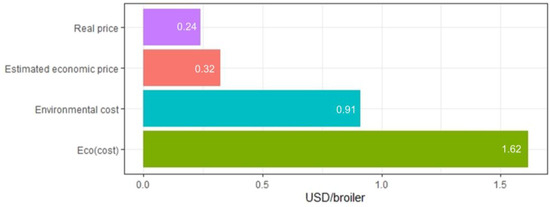 Comparison between the payments received by the broiler smallholders for their services (real price) and the estimated payment considering the economic cost (plus 10% of profit; estimated economic price), the estimated payment considering the emprice without cultural information (“environmental cost”) and the estimated payment considering the emprice with cultural information (“eco(cost)”). The emprice is a measure of the money that circulates in an economy as the result of some processes [38]. The emprice was obtained by dividing the broiler system emergy under a smallholder’s responsibility by the emdollars received as payment for services. The dollar value was used for the real price and the estimated economic price. BRL-to-USD exchange rate = 3.65:1.00.