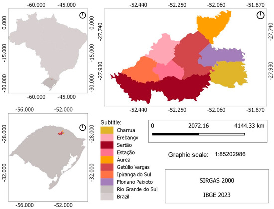 Its production units are located in eight surrounding municipalities: Áurea (1 property), Charrua (2), Erebango (8), Estação (4), Floriano Peixoto (2), Getúlio Vargas (17), Ipiranga do Sul (1), and Sertão (4) [19] (Figure 1). Among the crops and products of greatest interest are beef, pork, and chicken; eggs; fruits, such as apples and bananas; organic bean and rice cereals; corn and wheat flours; horticultural products, such as cassava, potatoes, tomatoes, onions, garlic, cauliflower, broccoli, seasonings, and salads; products from the bakery industry, which are different types of pasta and biscuits; dairy products, such as cheese and milk.
