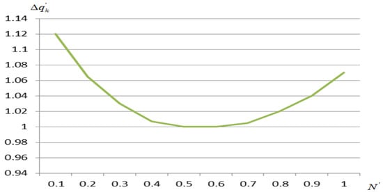 The relative fuel consumption coefficient of a ship’s engine (), depending on the relative power of the ship’s engine(s) ().