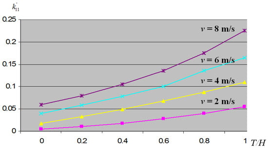 The added mass of water depends on the speed of the ship and the draft of the ship, as well as on the depth of the navigational channels and port water area, i.e., the ratio (T/H). Additional water mass coefficients are usually used for the calculation, as shown in Figure 4, when the ship is moving longitudinally, which corresponds to the navigation of ships in port channels [4,5].
