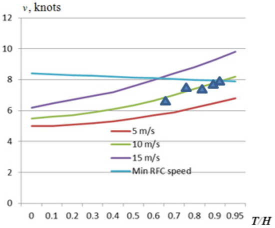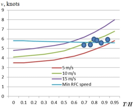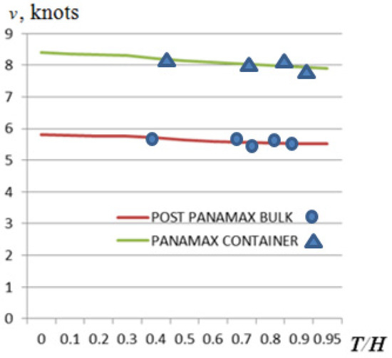 Many harbors have limited depths, and with a small clearance between the ship’s hull and the bottom of the navigation channel, the added water mass increases and, at the same time, the resistance of the ship’s hull increases. The decrease in ship speed at low depth can be calculated using the following formula [22,55]: