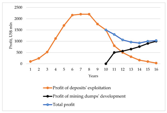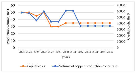 As a result, a sequence was obtained for the technogenic deposits’ involvement considering all mountain dumps development by 2036. It is possible to reduce the period of mining dumps development in four years. There could be recommendations to increase the funding for the dump’s development for the 2026–2029 period. As Figure 4 shows, the capital costs and production volume correlate providing that obtained order of technogenic resources involvement into economic circulation has been realizing. This ensures high production profitability.