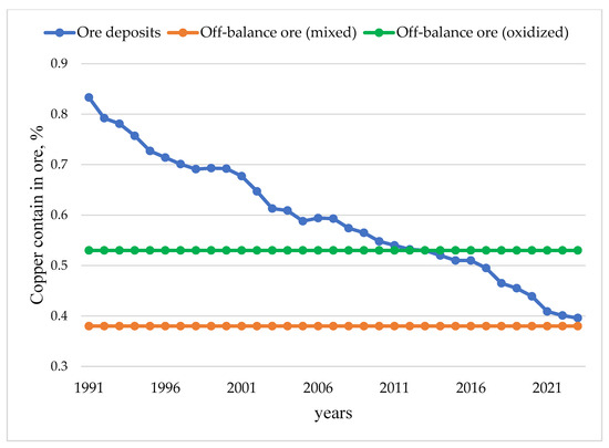 In 2012, the percentage of copper in the ore of the deposit and the ore of the dumps was equal. In 2021, the copper content in the ore of the deposit was at the level of copper content in the oxidized dumps. It is estimated that the average period for technogenic deposit development is 25–30 years. The main task of copper ore deposit dumps’ involvement is to rationally determine the procedure for mining based on economic, social, and environmental goals.