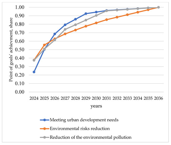 The following trajectories show the achieved social development and environmental security goals by the mining dumps development according obtained order (Figure 5).