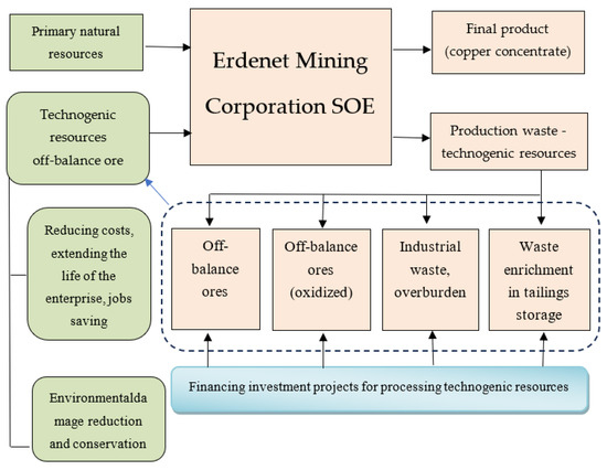 The approach supposes the involvement of technogenic deposits as a new resource base for copper mining enterprises that makes it possible to extend its life considering the depletion of ore, to obtain useful products by recycling waste, and to reduce the environmental pollution. It also helps to decrease social risks through keeping local jobs and ensuring sustainable development. The developed approach has been justified upon the case of the Erdenet mining enterprise in Mongolia—one of the world largest copper mine developers. The result of the study is precisely the development of a model for the replacement of primary natural resources with secondary ones (resources of technogenic deposits). The developed approach was designed to define the priority order of dump mining development to achieve the desired economic, social, and environmental effects. The individual sets of criteria can be used for a specific production facility. Its composition should be dictated by geographical features, occupied dump areas, percentages of mined ore, the impact of dumps on the environment, and other factors. The research has proved that the technogenic deposits have a significant impact on the economics of mining enterprises and could be used for environmental improvement through the use of non-renewable natural resources. The proposed approach offers a mechanism for cost reduction by using technogenic raw materials for the production of finished products. With this mechanism, when the resource base is depleted, the mining company has an opportunity to prolong its activity by retaining higher profits and employees. The development of mining dumps for the production of building materials (sand, crushed stone, and gravel) could be the needed problem-solving solution through liquidation of accumulated environmental damage.