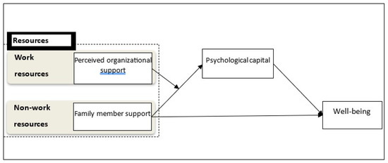 Both familial and organizational support is based on the relational dynamics of employees, serving as important relational resources [9]. However, the literature has not fully explored the potential interaction effects of these two relational factors on an employee’s well-being, nor have the underlying mechanisms been clearly explained. Our study addresses this gap and contributes to the literature by empirically examining (i) the impact of family relational resources, a non-work domain social support, on employee well-being; (ii) the potential mediating role of positive psychological capital in the link between family support and well-being; and (iii) how perceived organizational support, a work domain social resource, can enhance the effect of family support on well-being.