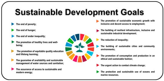 The United Nations Department of Economic and Social Affairs [] has outlined the sustainable development goals (SDGs), which delineate the direction for sustainable development in several areas []. These goals encompass social, environmental, and economic aspects, providing a comprehensive framework for fostering sustainability [,,,,]. The SDGs consist of 17 goals that encapsulate various dimensions of sustainability, as referenced by multiple authors, indicating their significance and widespread recognition [,,]. Figure 1 illustrates these 17 SDGs.