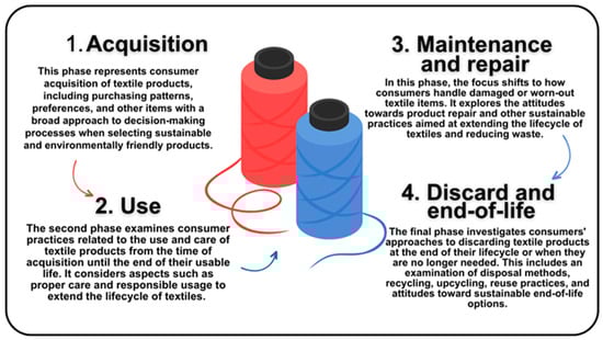 The research team, in collaboration with experts in the field and partners from the project be@t, designed the questionnaire under the same name. The Questionnaire be@t was thoughtfully structured into four sections, aligning with the four key phases of interest in sustainable consumer behavior regarding textiles, as identified by the research team in consultation with experts from the field. This questionnaire is depicted in the supplementary file (Supplement S1). Figure 2 below depicts the representation of the four identified phases, capturing the essence of the questionnaire.