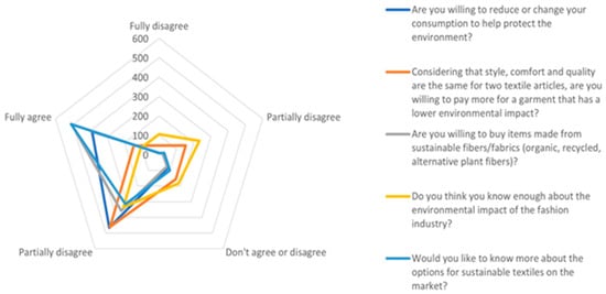 Participants were presented with a series of questions concerning their willingness to adopt sustainable behaviors, to which they responded using a five-point Likert scale. The radar chart in Figure 6 indicates that most participants were ready to embrace the suggested behaviors. Notably, opinions were divided when participants were asked about their level of knowledge regarding the environmental impact of the fashion industry. A considerable number remained undecided, while a larger group partially disagreed, and the majority partially agreed. Furthermore, most expressed a keen interest in learning more about the sustainable options for textile items available in the market.