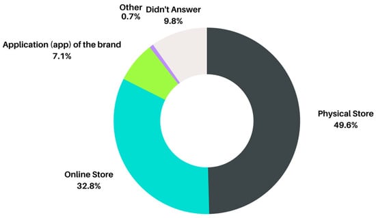When asked what platforms they use to gather information about products (MC), the main source of information indicated by participants (51%) remains physical stores, while 33.8% of participants prefer online stores for this purpose. A smaller percentage of participants rely on brand applications to obtain product information before making a purchase (see Figure 7).