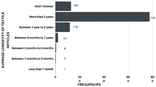 Participants were asked about the longevity of their textile items (MC), with most respondents (73.5%) reporting that they kept their textile items for over two years before discarding them. A small proportion (12.2%) chose not to respond to this question. Figure 9 illustrates the distribution of these results.