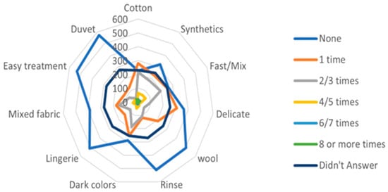 Participants were questioned about their clothes-washing habits (LS). The radar chart in Figure 12 presents the distribution of average uses for washing machine programs over a week. It is possible to observe that most programs are used very little, with most participants stating they do not use them at all; an example is the cotton program. Other programs, such as rinse and duvet, show a more balanced use.
