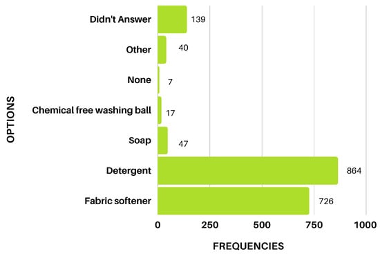 Respondents were asked which chemical items they use in clothes washing (MC). Most participants use detergent and/or fabric softener in washing, while a smaller percentage of participants use soap and chemical-free washing balls. A smaller percentage of the sample (0.66%) do not use chemical items in washing textiles. These results are made explicit in Figure 13.
