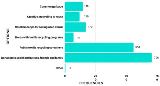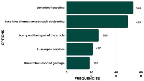 When asked how they handle a damaged textile item (MC), the largest portion of participants (50.9%) opt to handle it by either donating or recycling it through textile item collection containers. Another considerable percentage of respondents (46.9%) prefer to repurpose the item for alternative uses (i.e., cleaning). In comparison, a smaller percentage of participants (17.6%) choose to dispose of the damaged items as regular undifferentiated trash, while 20.1% opt for professional repair services. Additionally, a substantial number of participants decided to repair the article themselves. These responses are visually depicted in Figure 15.