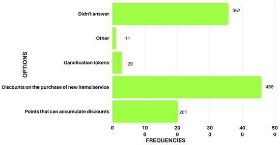 In the disposal phase, the findings reveal that over half of the participants practice conscious disposal, opting to donate textile items to charities, friends, and family or using recycling bins. The primary motivation for donation appears to be the belief that the items will be responsibly handled at the end of their lifecycle, showcasing an understanding of recycling’s environmental impact reduction and its role in the circular economy, speaking to the value of prescriptive and descriptive beliefs in the activation of personal norms. These choices highlight a concern for responsible disposal aimed at minimizing waste and contributing to sustainability. The literature points out the values observed by consumers when disposing and reusing items, pointing out that resale and donation behaviors can be explained by environmental concerns, while reuse and resale can be explained by economic factors, and convenience was a highly motivating factor for discard habits []. Interestingly, almost two-thirds of respondents believe brands should compensate consumers for handing over items they no longer use. The most desired form of compensation is through discounts on the purchase of new items or services. This reveals consumers’ expectations to be rewarded for their sustainable actions, encouraging them to continue participating in responsible disposal practices. These results highlight the importance of shared responsibility between consumers and brands in properly managing textile articles, promoting sustainability, and the valorization of natural resources.